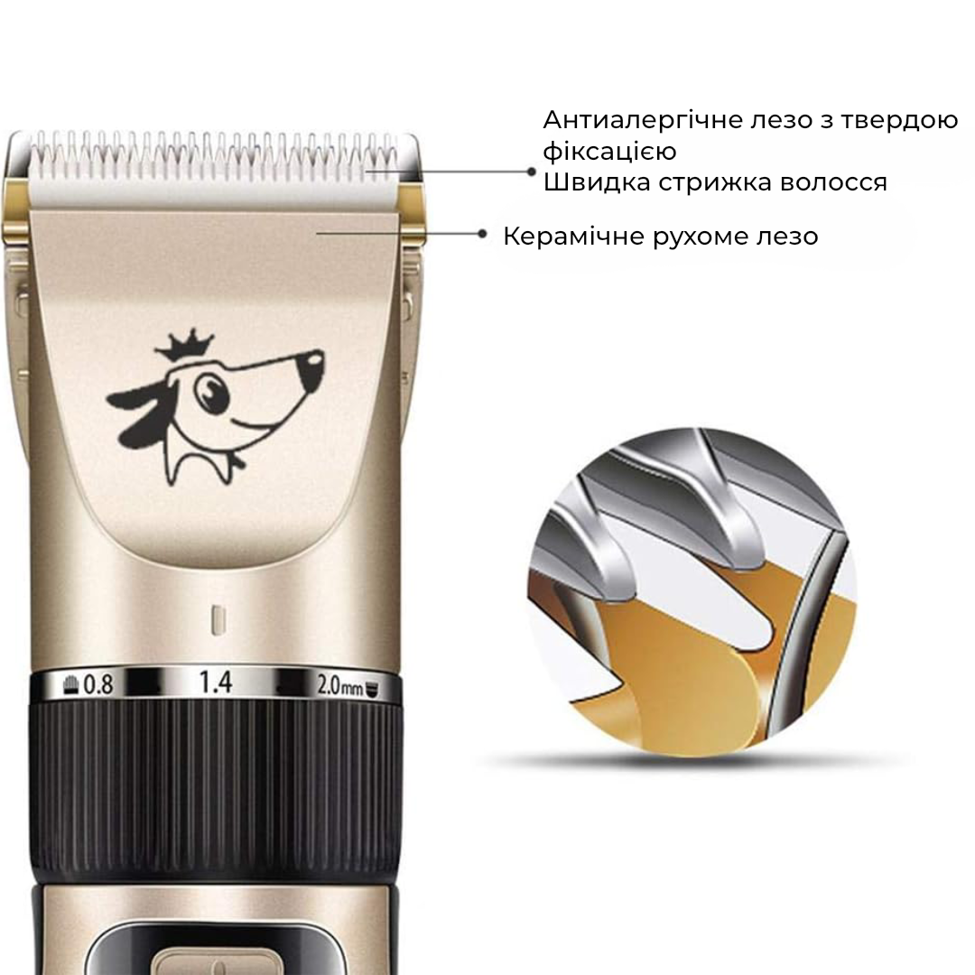 Машинка оснащена потужним двигуном, керамічними ножами з різними насадками та регулюванням робочої довжини. Завдяки чому можна стригти тварин із різною густотою та жорсткістю вовни.