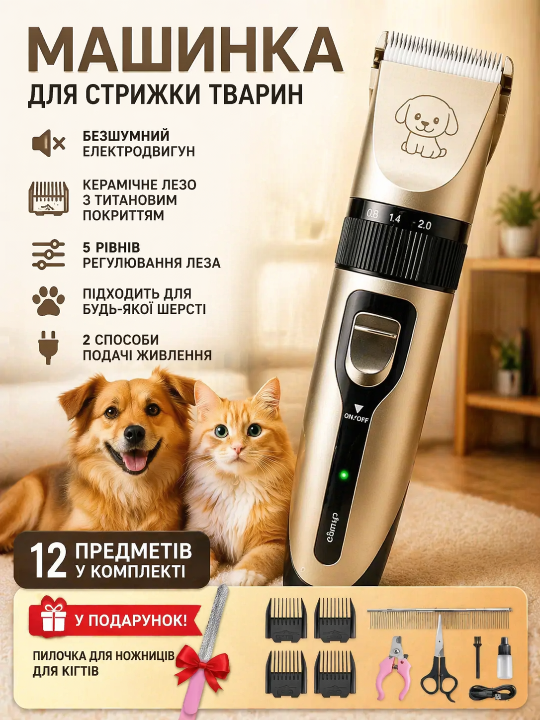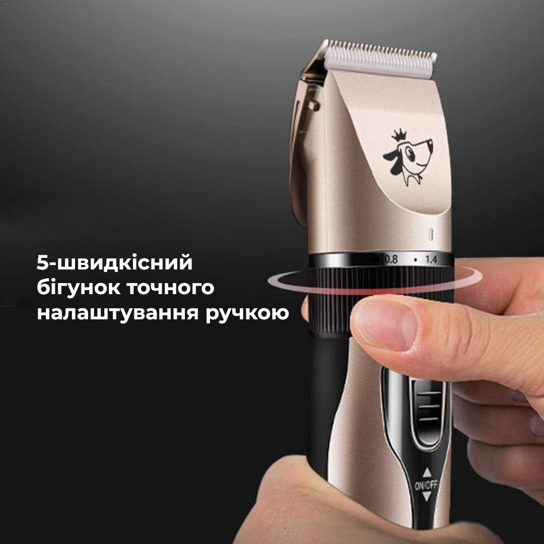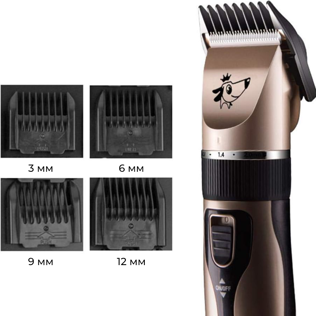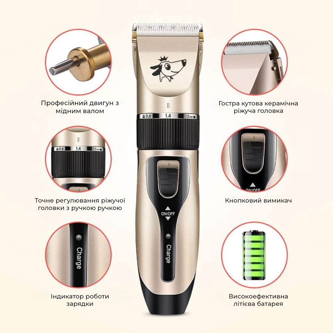 Машинка оснащена потужним двигуном, керамічними ножами з різними насадками та регулюванням робочої довжини. Завдяки чому можна стригти тварин із різною густотою та жорсткістю вовни.